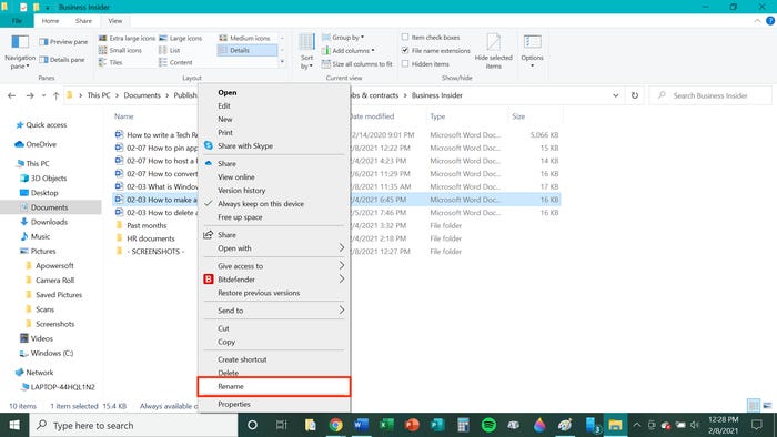 2. Щелкните правой кнопкой мыши документ, который хотите закрепить на панели задач. В появившемся меню нажмите «Переименовать».
