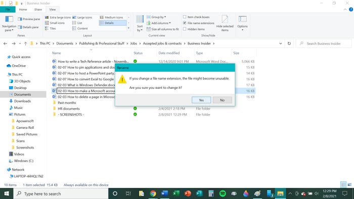 3. Измените расширение файла .doc или .docx в имени документа на .exe и нажмите клавишу ВВОД. Появится небольшое окно с предупреждением об изменении расширения файла; нажмите «Да», чтобы продолжить.