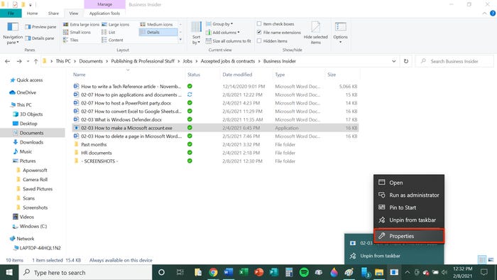 5. Ваш документ теперь появится на панели задач в виде приложения. Щелкните приложение правой кнопкой мыши, затем щелкните еще раз правой кнопкой мыши имя файла, когда оно появится в меню. Появится подменю. Щелкните «Свойства» в этом меню.