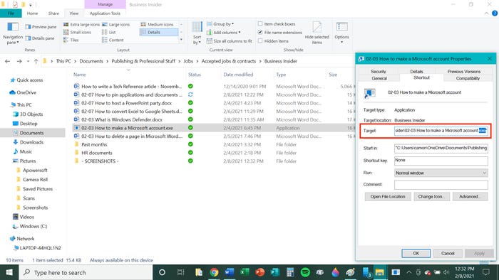 8. Прежде чем нажать «ОК» или «Применить» в окне «Свойства» , вернитесь в проводник и переименуйте исходный файл так, чтобы его расширение .exe совпадало с исходным расширением - опять же, скорее всего, это будет .doc или .docx. , как вы ввели в поле «Цель» на шестом шаге. Когда появится окно с предупреждением, нажмите «Да».